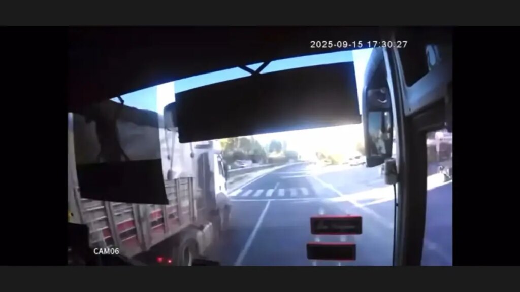 Malatya‘nın Darende ilçesinin Ulupınar Mahallesi’nde Salih Eken yönetimindeki 41 AOU 373 plakalı TIR’ın freninin boşalması nedeni ile denetimini yitirip yolcu otobüsüne çarparak şarampole devrildiği kaza, otobüs içerisindeki güvenlik kamerasına yansıdı.